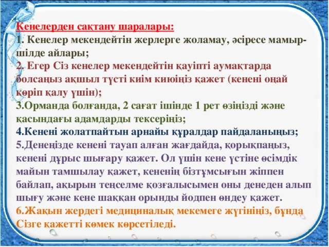 Көктемде және жазда кенелерді белсендіру кезеңінде ата-аналардың балалармен серуендеу кезінде қарапайым, бірақ маңызды мінез-құлық ережелерін қатаң сақтау қажеттілігіне ерекше назар аударамыз.